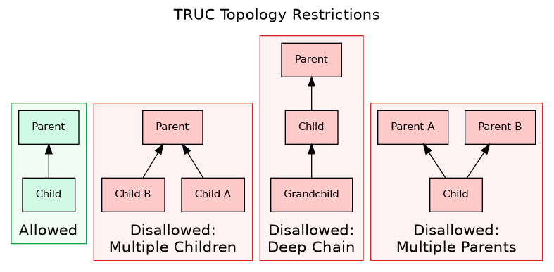 Within the TRUC topology, the questions become tractable. Is this child better than the existing child? Easy to compare when there’s only one of each. Should we allow this replacement? The transaction graph is small enough to reason about directly.