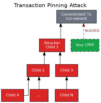 The attack was straightforward. Lightning commitment transactions are co-owned; either party can broadcast. If your counterparty broadcasts and immediately attaches a tree of low-feerate children, they can exhaust the descendant limit. Now you can’t attach your own CPFP. Your time-sensitive transaction is stuck at the fee rate it was signed with, potentially weeks or months ago.