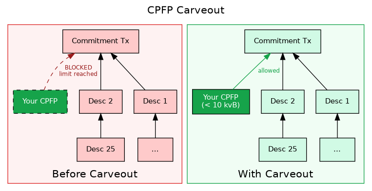 The rule was narrow by design. If a transaction is already at its descendant limit, one additional child extending from the original parent is allowed, provided that the child is small (under 10 kvB) and has exactly one ancestor (the transaction being bumped). This was enough for Lightning: even if your counterparty bloats the descendant chain, you can still attach one small CPFP transaction.