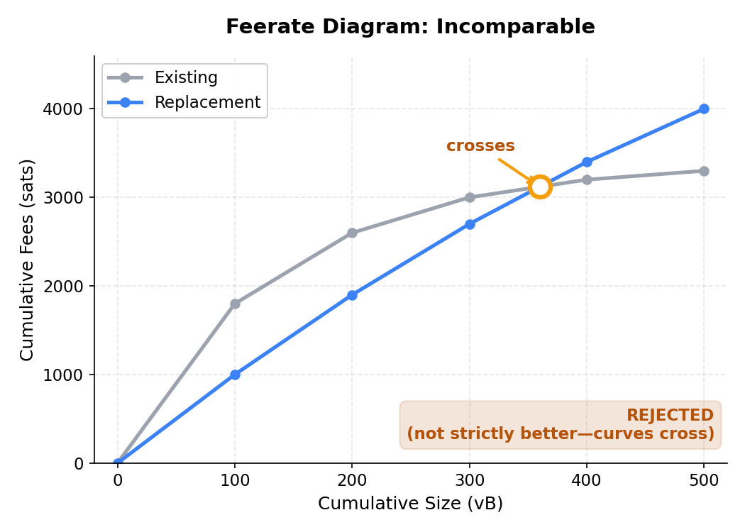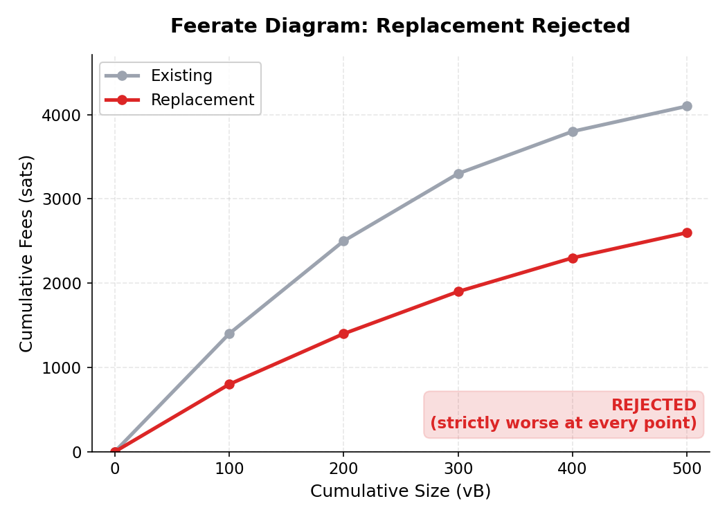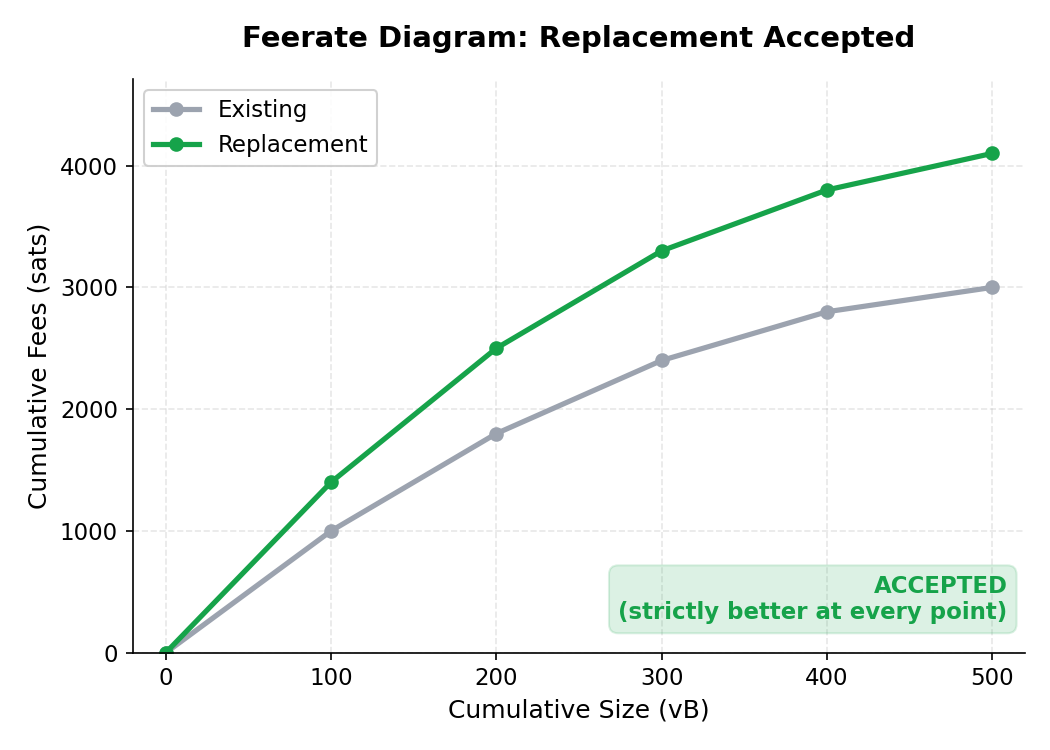 The key concept is the feerate diagram. Think of it as a curve representing the mempool’s mining value: at each point, how much cumulative fee have you collected for how much cumulative size? A mempool with good transactions has a diagram that rises steeply; a mempool full of low-feerate junk has one that rises slowly.