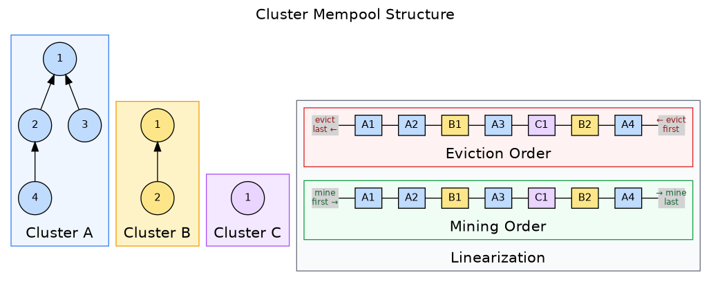 The core idea: group the mempool into clusters, where a cluster is a strictly limited (less than 64) set of connected components of transactions (any two transactions that share in-mempool relation). Within each cluster, maintain an optimal linearization, a valid ordering of transactions that maximizes fee revenue if mined in that order. Once these linearizations are set, the entire mempool of a node is totally ordered.