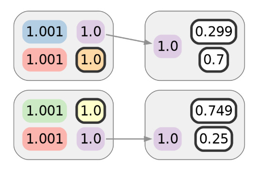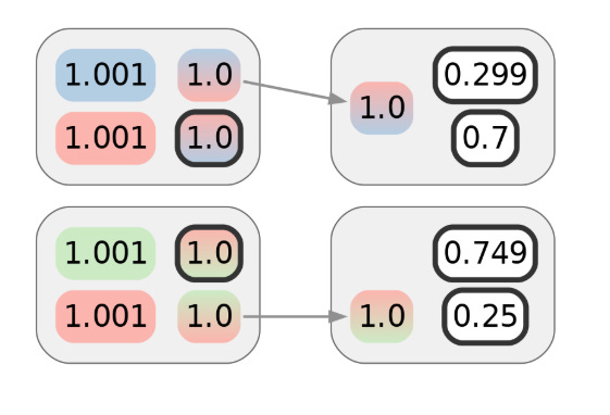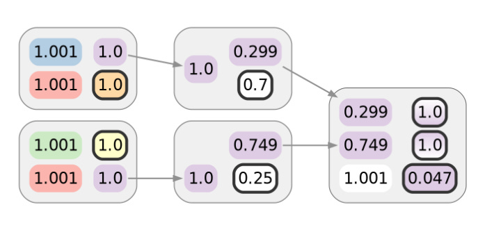 Visually, this combines the inferences of previous diagrams. For each coin in the purple cluster of the last two diagrams, we can intersect the sets of colors in the gradients depicted in the diagram before that: