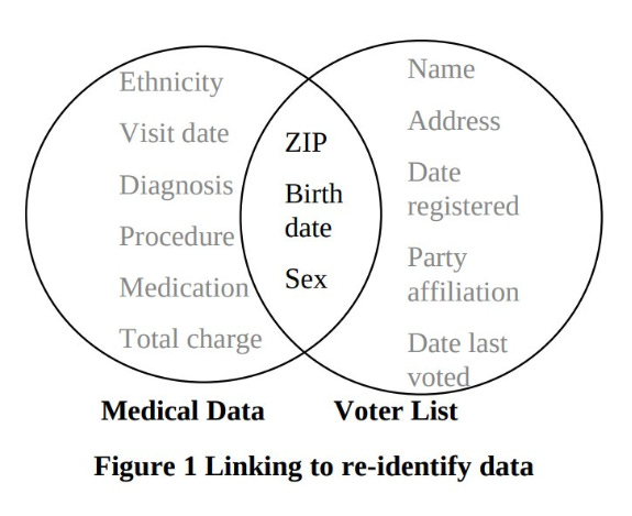 The following diagram from the paper will probably look familiar to anyone who has spent some time learning what an “inner join” is in SQL. It illustrates a different example where Sweeney linked medical records to the voter registration list using the same fields, identifying then-Massachusetts Governor William Weld’s specific record in an “anonymized” medical dataset: